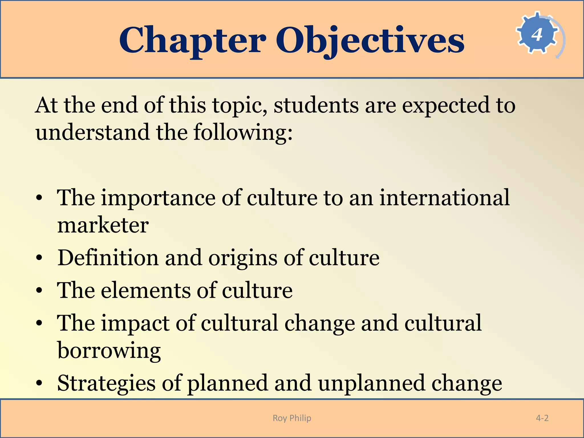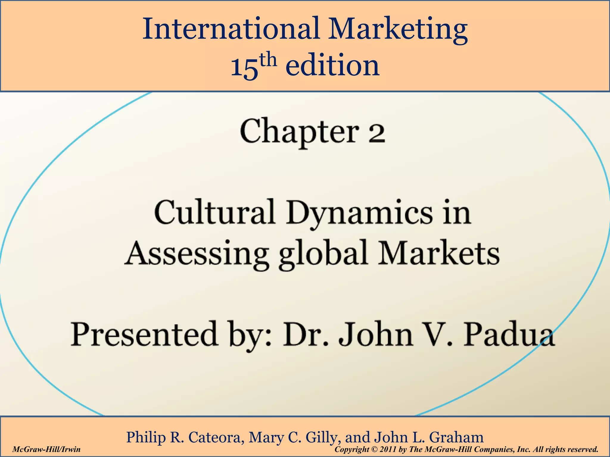 This document provides an overview of a textbook on international marketing. It discusses key topics covered in the textbook including the importance of culture in international marketing, definitions and origins of culture, elements of culture like values and symbols, cultural change and borrowing, and strategies for planned and unplanned cultural change. The objectives are for students to understand these cultural concepts and their impact on international marketing.