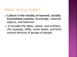This document discusses key concepts related to culture and society. It defines culture as the totality of learned behaviors and beliefs shared by a group of people. A society consists of people who share a common culture and heritage. All societies exhibit certain cultural universals, or practices that meet essential human needs. While cultural practices are universal, how they are expressed varies across cultures. The document also discusses concepts like ethnocentrism, cultural relativism, norms, values, and the role of language and symbols in shaping culture.