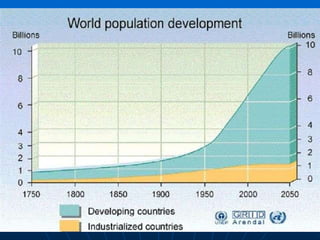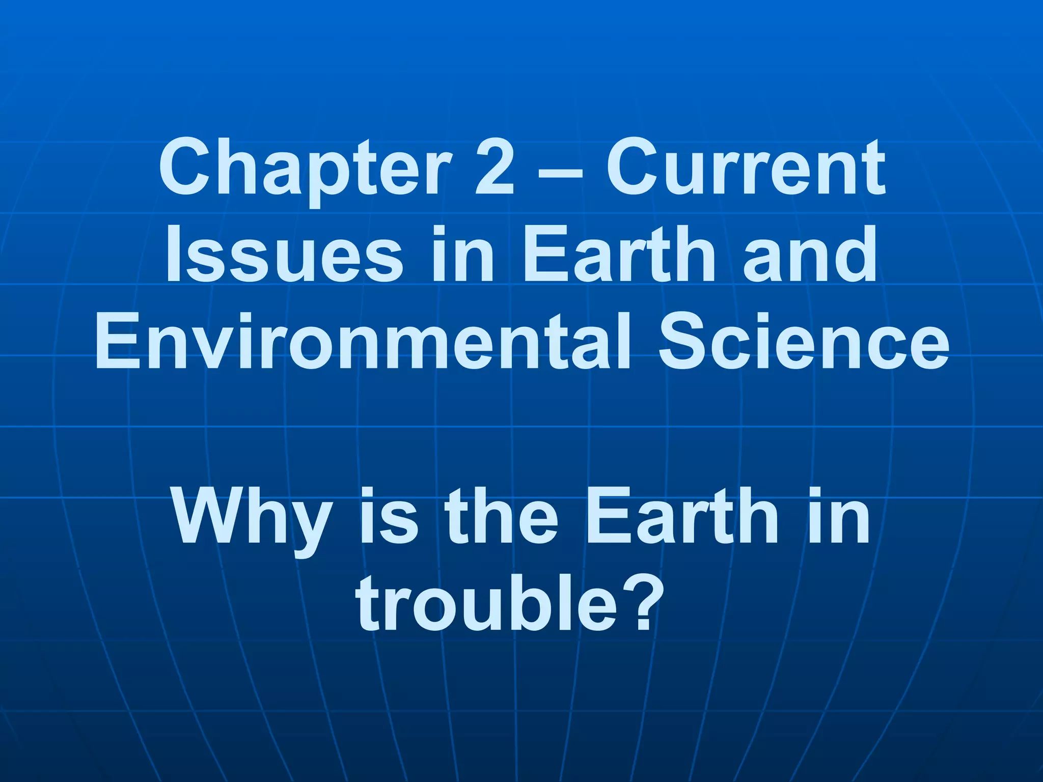 This document provides an overview of current environmental issues facing the Earth. It discusses how human population growth and industrialization have negatively impacted the environment through increased consumption of non-renewable resources, pollution, and loss of biodiversity. As human societies developed from hunter-gatherers to agricultural to industrial, their demands on the environment expanded and dependence on fossil fuels rose, resulting in problems like pollution and depletion of resources. The core issues discussed are overconsumption, pollution, and biodiversity loss due to rising human populations. The document also introduces the concept of sustainability and the goal of creating a sustainable society that does not exceed the Earth's limits.