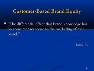 This document discusses customer-based brand equity. It defines customer-based brand equity as the differential effect that brand knowledge has on consumer response to marketing for that brand. It describes the components of brand knowledge as brand awareness and brand image. The document outlines Keller's customer-based brand equity pyramid model, which shows how brand identity, meaning, response, and relationships drive resonance. It discusses how building brand awareness, image, judgments, feelings, performance, and imagery can increase customer-based brand equity.