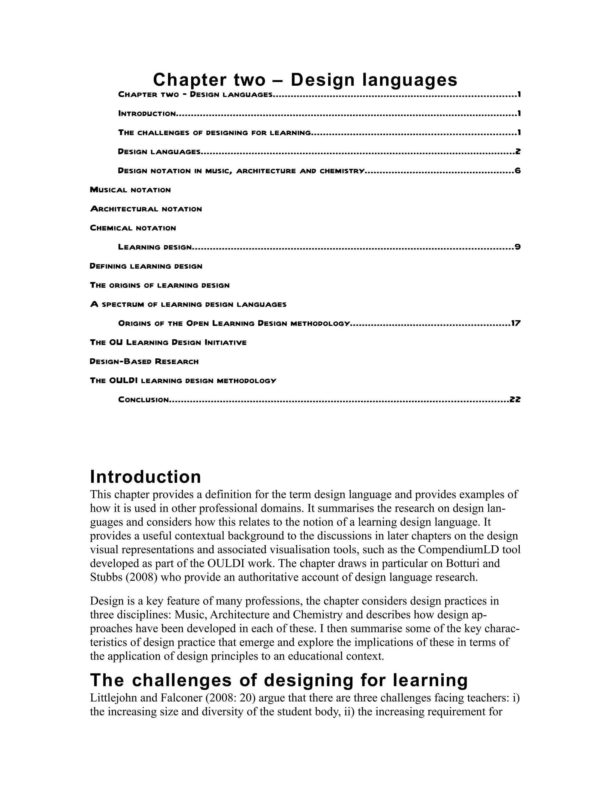 This document provides an overview of design languages and their use in different domains such as music, architecture, and chemistry. It discusses the challenges of designing for learning and reviews research on learning design languages. Different types of design languages are described along with their purposes. The origins of the Open Learning Design methodology are also summarized as providing a framework for using design languages and visual representations to support the design of effective learning interventions.