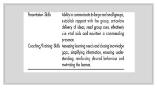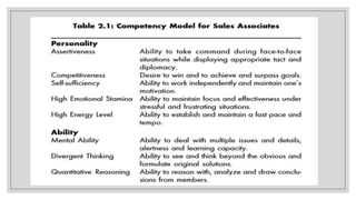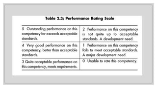 The document discusses the development and importance of competency models in organizations, emphasizing their role in aligning workforce capabilities with business strategy and enhancing human resource processes such as selection, training, and performance management. It outlines the complexities of defining competencies, including both inherent and acquired attributes, and details the various competencies required for effective performance in different roles. The text also explains methodologies for creating competency models and their adaptability to changing business environments, thus supporting the strategy and values of organizations.