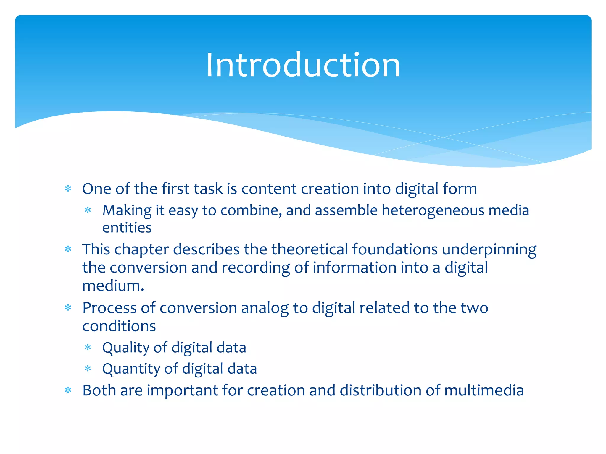 This chapter describes the process of converting analog signals to digital form. It discusses sampling, where the analog signal is captured at discrete time intervals. It also discusses quantization, where the amplitude of the signal at each sample is assigned a digital value. The sampling rate and number of quantization levels affect the quality and size of the digital data. Digital signals have advantages over analog like improved quality, ability to edit and combine content, and efficient compression and storage. The chapter also covers filtering of digital signals.