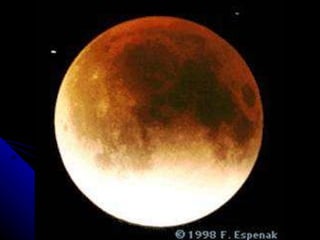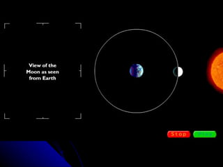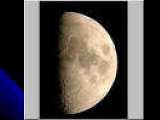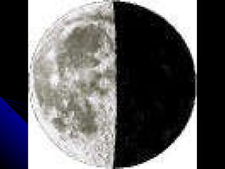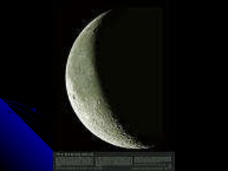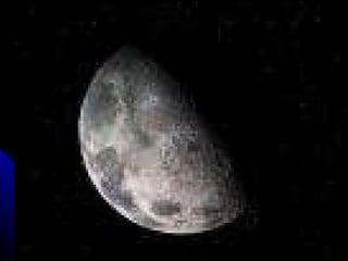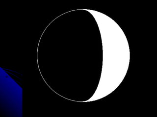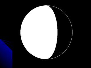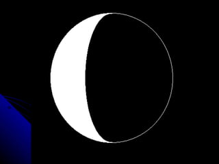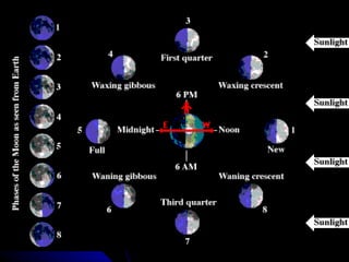 The document discusses the phases of the moon. It explains that the moon does not produce its own light, but rather reflects light from the sun. As the moon orbits Earth, different portions are illuminated by the sun, appearing to change shape from our perspective on Earth. This cycle, where the illuminated portion appears to grow and then shrink over the course of around 29.5 days, is what causes the phases of the moon. The document then defines and provides images for each of the 8 main phases: new moon, waxing crescent, first quarter, waxing gibbous, full moon, waning gibbous, last quarter, and waning crescent.