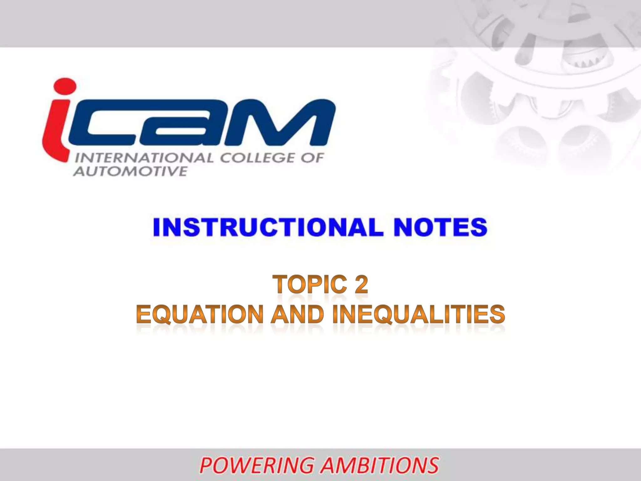 This document outlines learning outcomes and topics for a math lesson. The lesson will cover: 1) recognizing and solving linear and quadratic equations using factorization, quadratic formula, and completing the square; 2) solving simultaneous 2x2 systems using substitution and elimination; 3) identifying inequalities and their properties and solving linear and quadratic inequalities; and 4) identifying and solving absolute value equations.