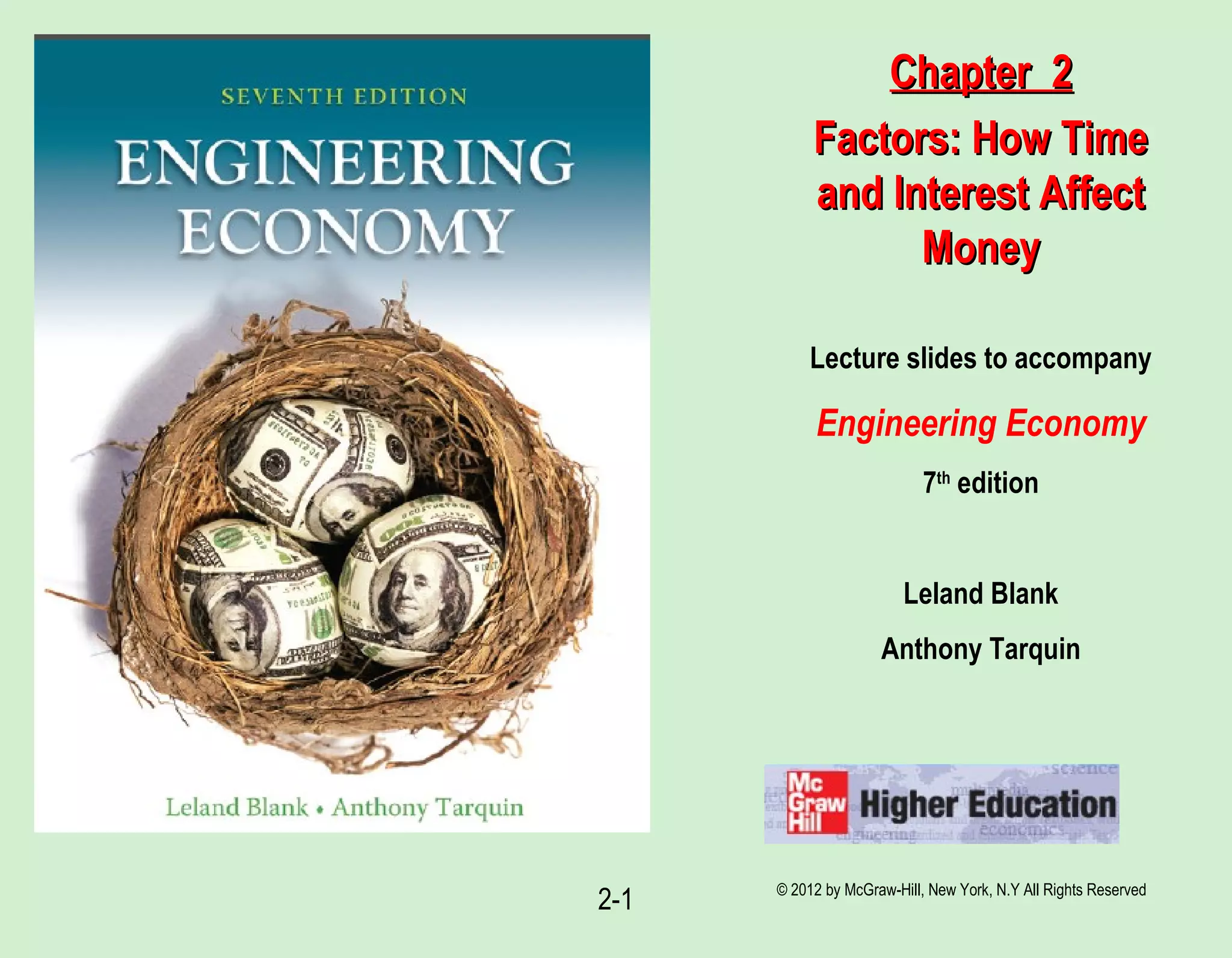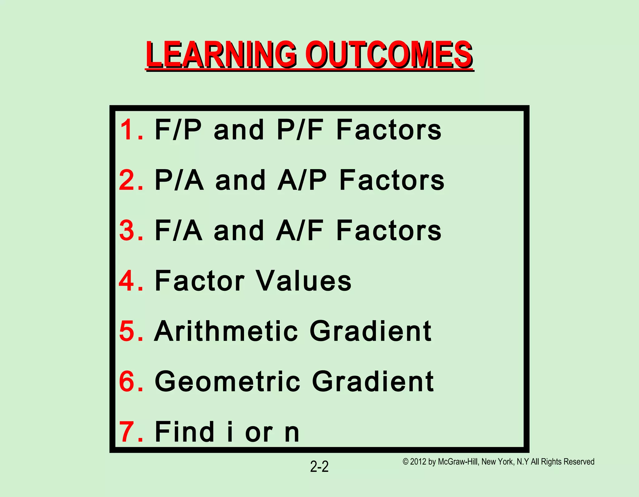 This document discusses factors related to time and interest rates that affect money. It covers single payment factors, uniform series factors, arithmetic and geometric gradients, and methods for finding unknown interest rates or time periods. Key learning outcomes include single payment, uniform series, and gradient factors as well as techniques for determining factor values for untabulated rates or periods. Examples are provided to illustrate concepts such as single payments, uniform series, arithmetic gradients, and finding unknown rates or time periods.
