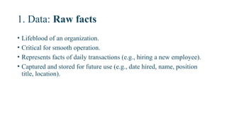 • In HRIS, data includes facts about age, gender, education.