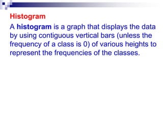 This document discusses different types of graphs and charts that can be used to represent frequency distributions of data, including histograms, frequency polygons, ogives, bar charts, pie charts, and stem-and-leaf plots. It provides examples of how to construct each graph or chart using sample data sets and discusses key aspects of each type such as class intervals, relative frequencies, and ordering of data. Guidelines are given for determining the optimal number of classes and class widths for grouped data. Exercises at the end provide practice applying these techniques to additional data sets.
