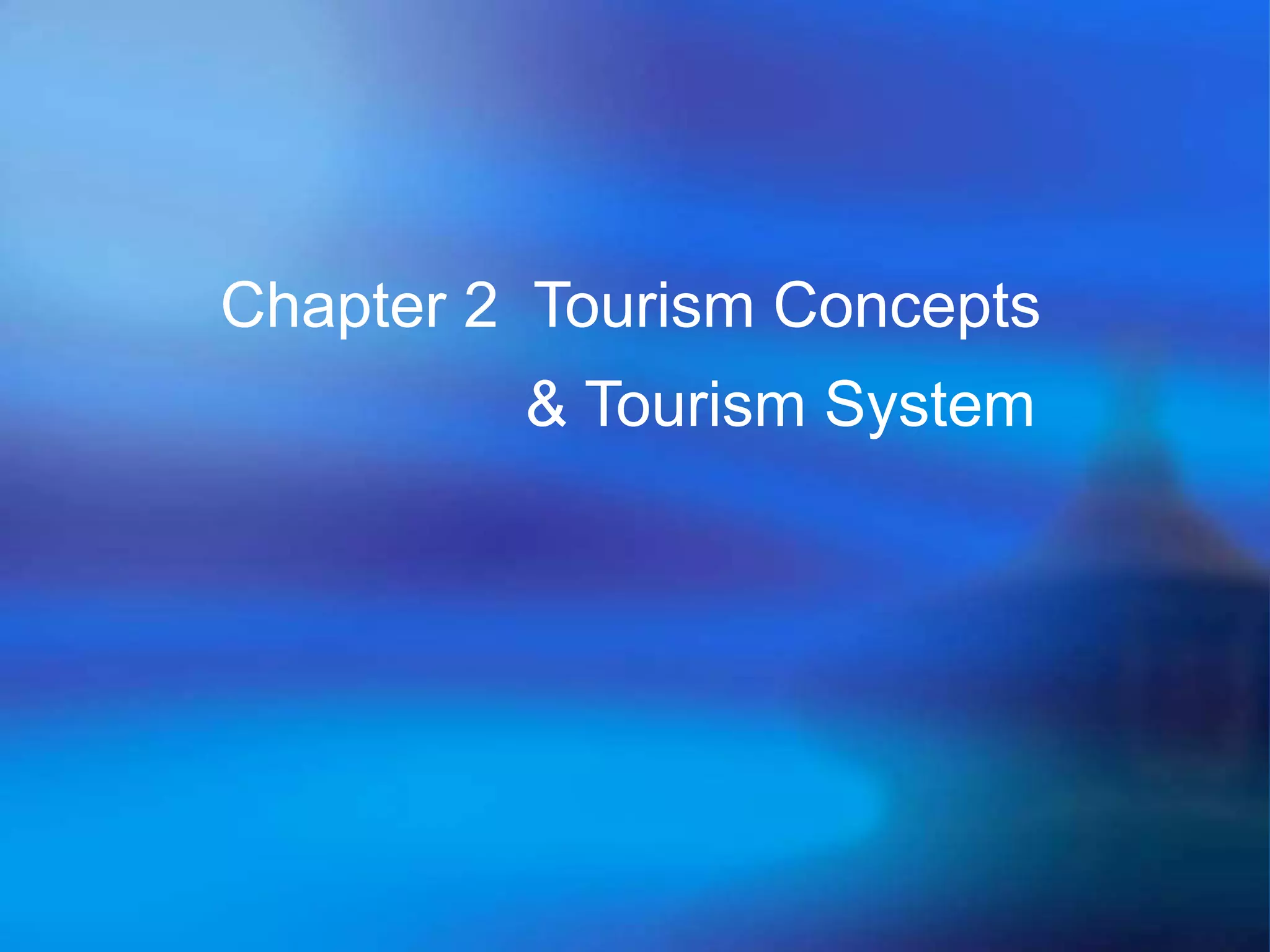 This document discusses key concepts in tourism and introduces a systems approach to understanding tourism. It defines fundamental concepts like tourism, visitors, tourists and excursionists. It explains why tourism is not considered an industry and introduces the tourism system model, which views tourism as having four interconnected parts: destination, marketing, demand, and travel. The systems approach emphasizes the interdependencies between these parts and between tourism and its surrounding environment.