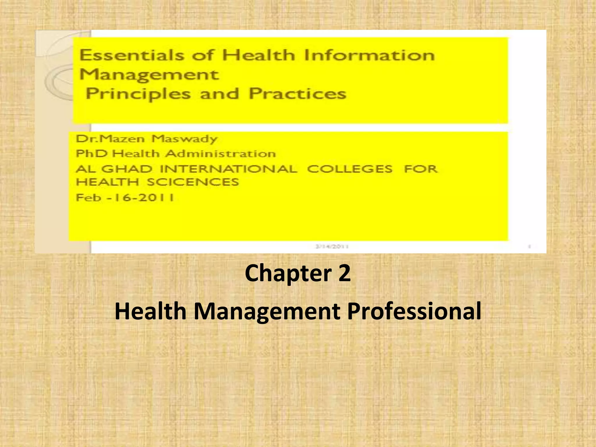 This chapter discusses various career opportunities in health information management, including cancer registrars, coding and reimbursement specialists, health information managers, health insurance specialists, health services managers, and medical assistants. It describes the typical education, training, certification requirements, and job duties for each career type, as well as potential employment opportunities. The chapter emphasizes that health information management combines aspects of healthcare and information technology.