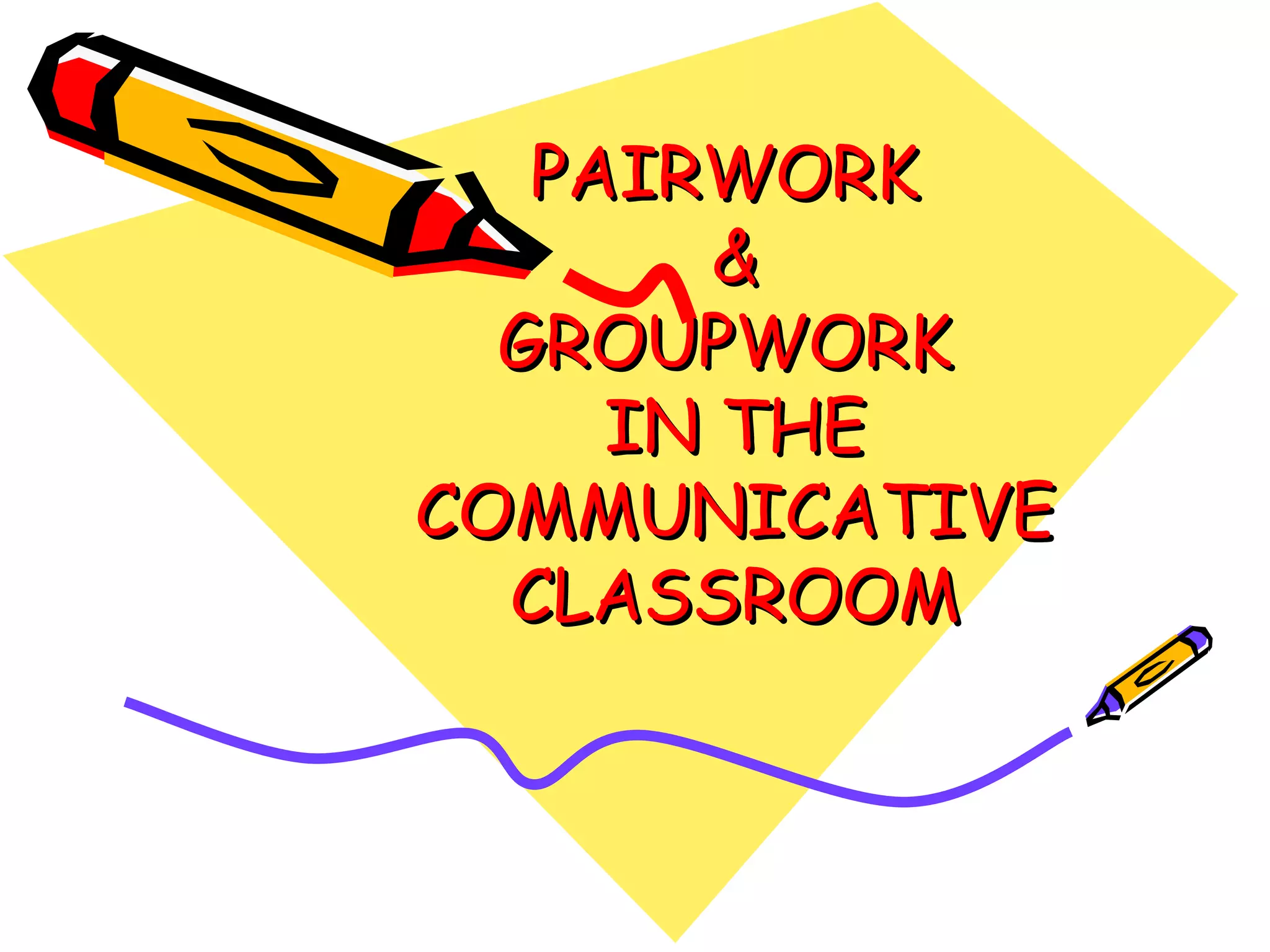 The document discusses the benefits of using pairwork and groupwork in the communicative classroom. It argues that these activities 1) motivate students by providing meaningful face-to-face interactions that resemble real-world communication, 2) increase opportunities for language practice as students can interact in smaller groups, and 3) allow students to monitor their understanding and be understood by interacting with classmates. Additional benefits include helping build understanding as students can discuss with peers and giving students more freedom in a learner-centered approach. Potential disadvantages are that the teacher may not see all student participation and shy students could feel frustrated, but providing a relaxing atmosphere can help address this.