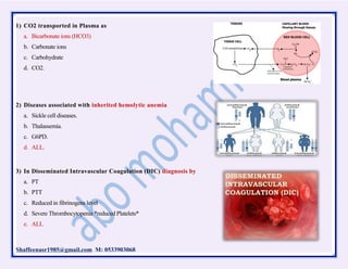 This document contains 85 multiple choice questions related to hematology. It covers topics like hemoglobin transport, inherited anemias, blood clotting disorders, white blood cell functions, platelet counts, blood typing, transfusion reactions, and more. The questions are intended to test knowledge of hematology for medical licensing or certification exams.