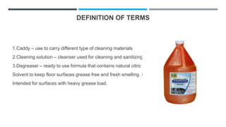 The document provides definitions and instructions for cleaning equipment and materials used in hotel guest rooms. It defines common terms like caddy, cleaning solution, and disinfectant. It describes the purpose and use of various cleaning equipment like vacuum cleaners, electric floor polishers, and room boy's trolleys. Procedures are outlined for assembling and disassembling vacuum cleaners and electric floor polishers. The types of cleaning materials and supplies are defined along with their uses and care. Proper procedures are also described for setting up a room boy's trolley with cleaning materials.