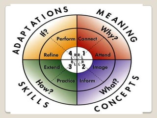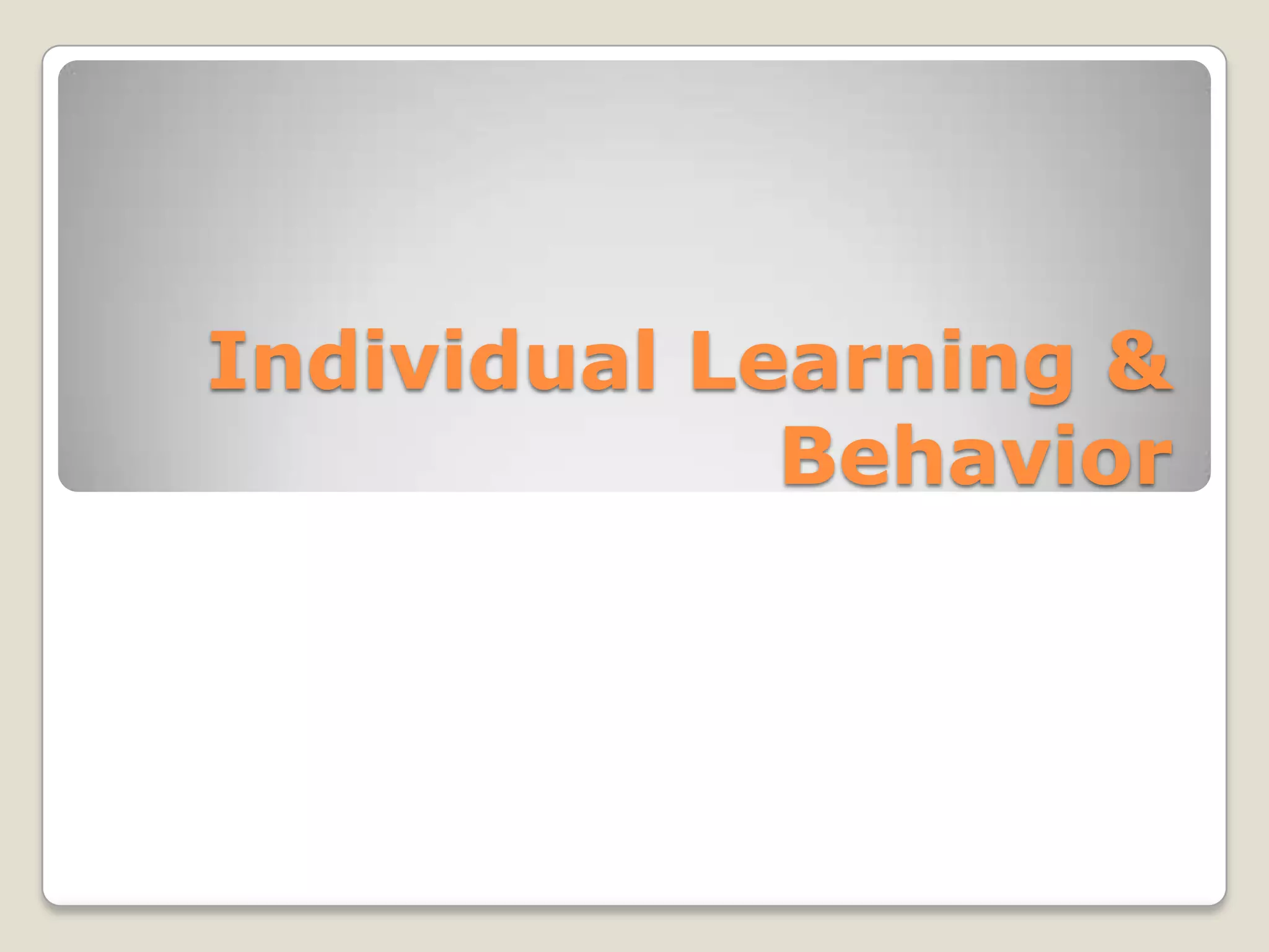 It also describes different learning styles including divergers, convergers, accommodators, and assimilators based on how people perceive and process information. Reinforcement and behavior modification aim to increase desired behaviors through consequences like rewards or praise.