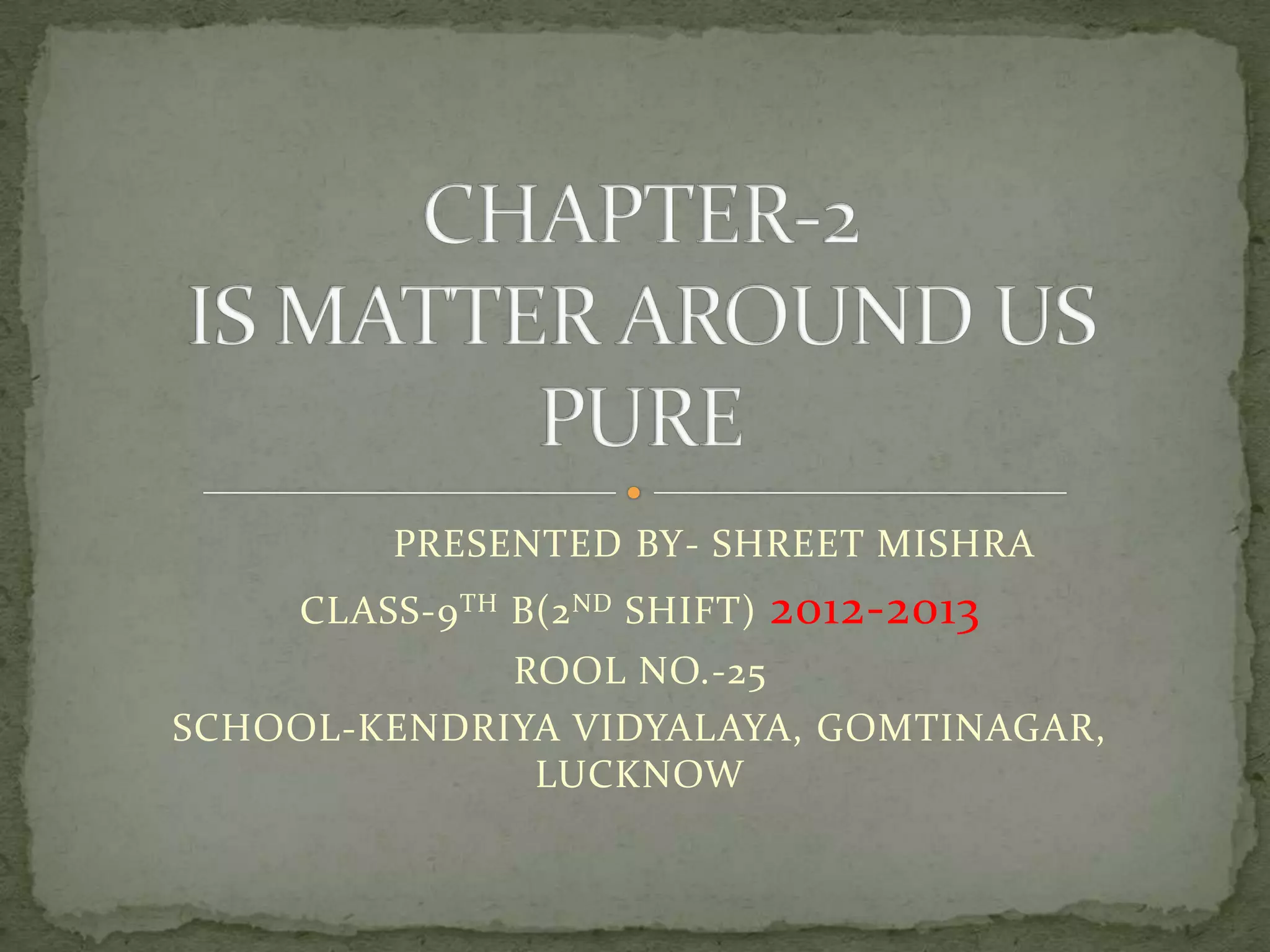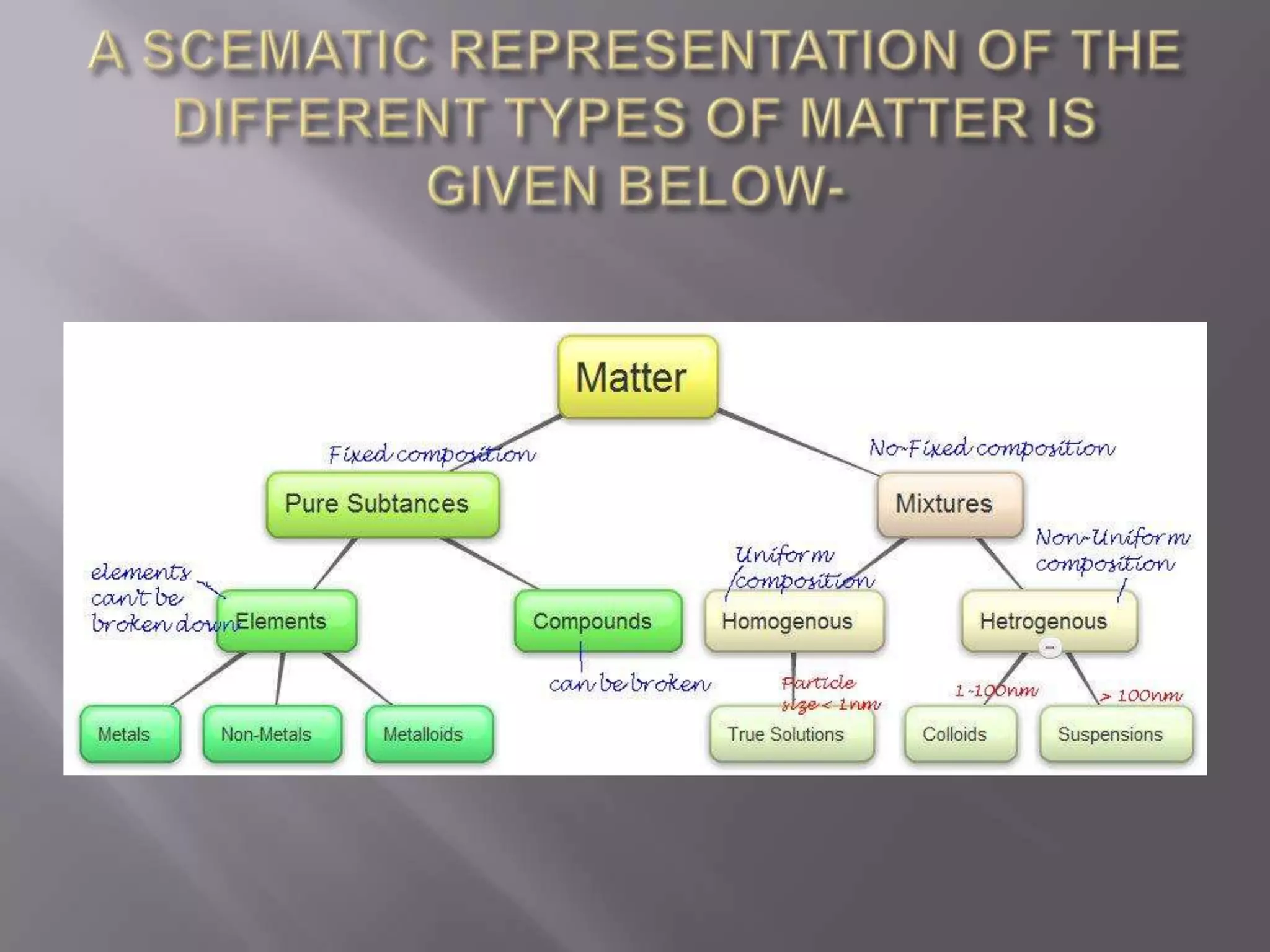 Matter can be classified as pure substances or mixtures. Pure substances are either elements or compounds, while mixtures can be homogeneous or heterogeneous. Solutions are homogeneous mixtures where one substance dissolves evenly throughout another. There are several processes that can separate mixtures into their component substances, such as evaporation, crystallization, centrifugation, chromatography, and distillation. Physical changes alter the state of matter but do not change its chemical makeup, while chemical changes form new substances through chemical reactions.
