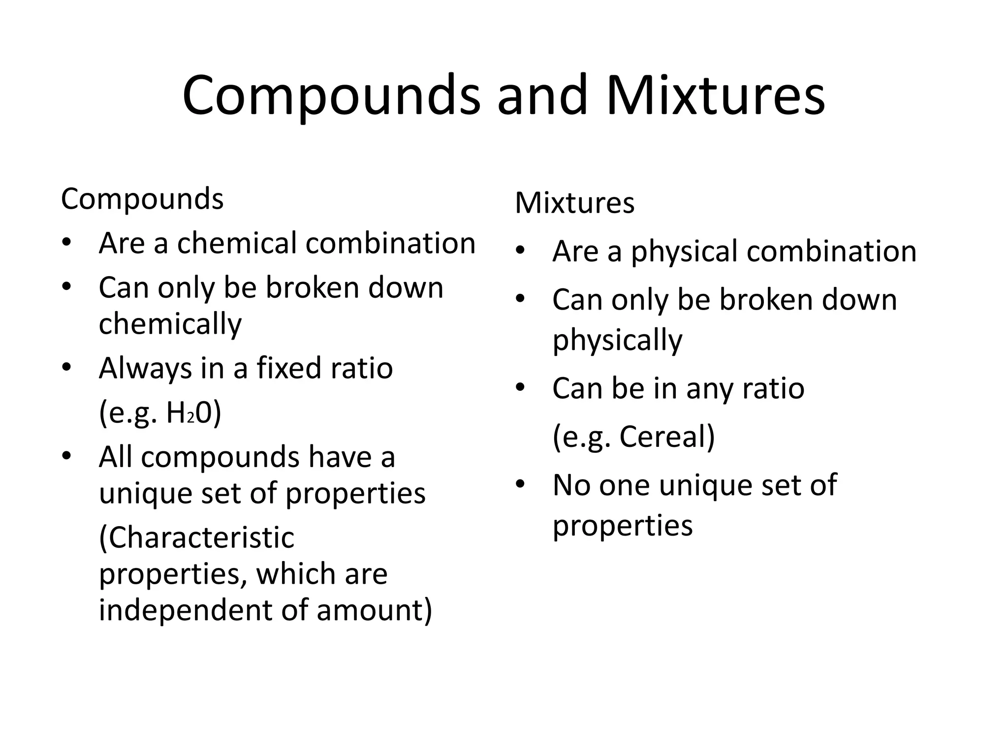 - Compounds are chemical combinations with fixed ratios while mixtures can have varying ratios.