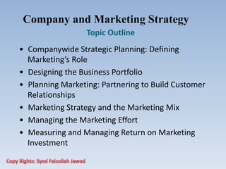 The document discusses companywide strategic planning and marketing strategy. It outlines the steps in strategic planning which include developing mission and vision statements to define the company's objectives. It also discusses designing the business portfolio, partnering with customers to build relationships, and developing an integrated marketing mix. The marketing mix consists of the 4Ps: product, price, place, and promotion. The document emphasizes developing a customer-centered approach and implementing marketing plans through effective organization.