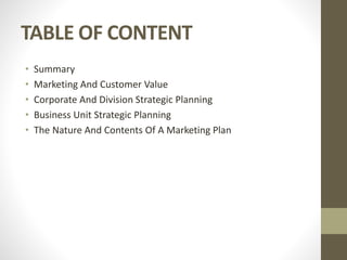 The document discusses marketing strategies and plans at different organizational levels. It covers developing marketing strategies through understanding customer value, strategic planning at the corporate and business unit levels, and creating marketing plans. Specifically:
