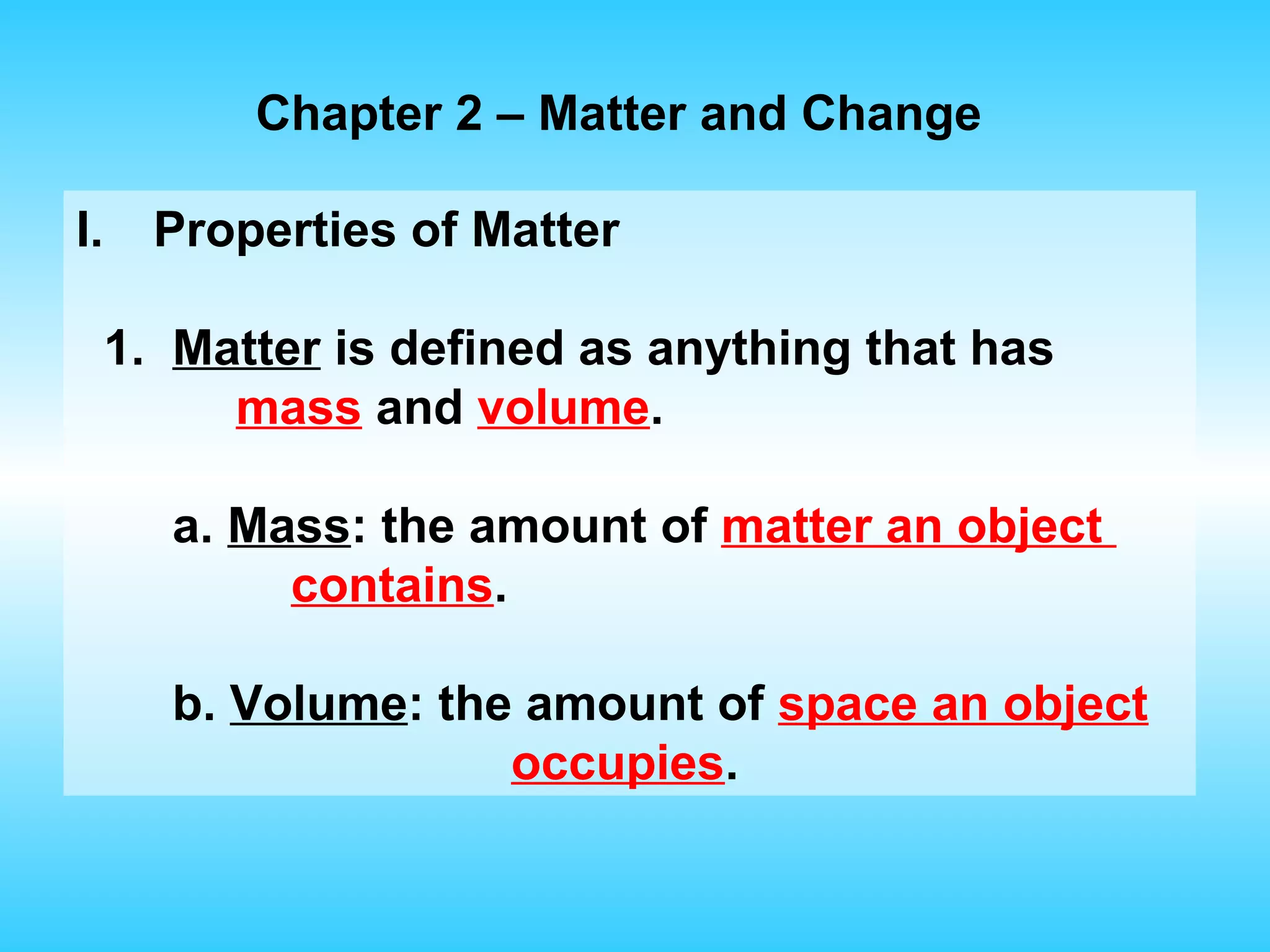 Chapter 2 discusses matter and its properties, defining matter as anything with mass and volume. It explains the classifications of substances into elements, compounds, and mixtures, highlighting their characteristics and methods of separation. The chapter also covers physical and chemical changes, chemical reactions, and the conservation of mass, illustrating key concepts with examples.