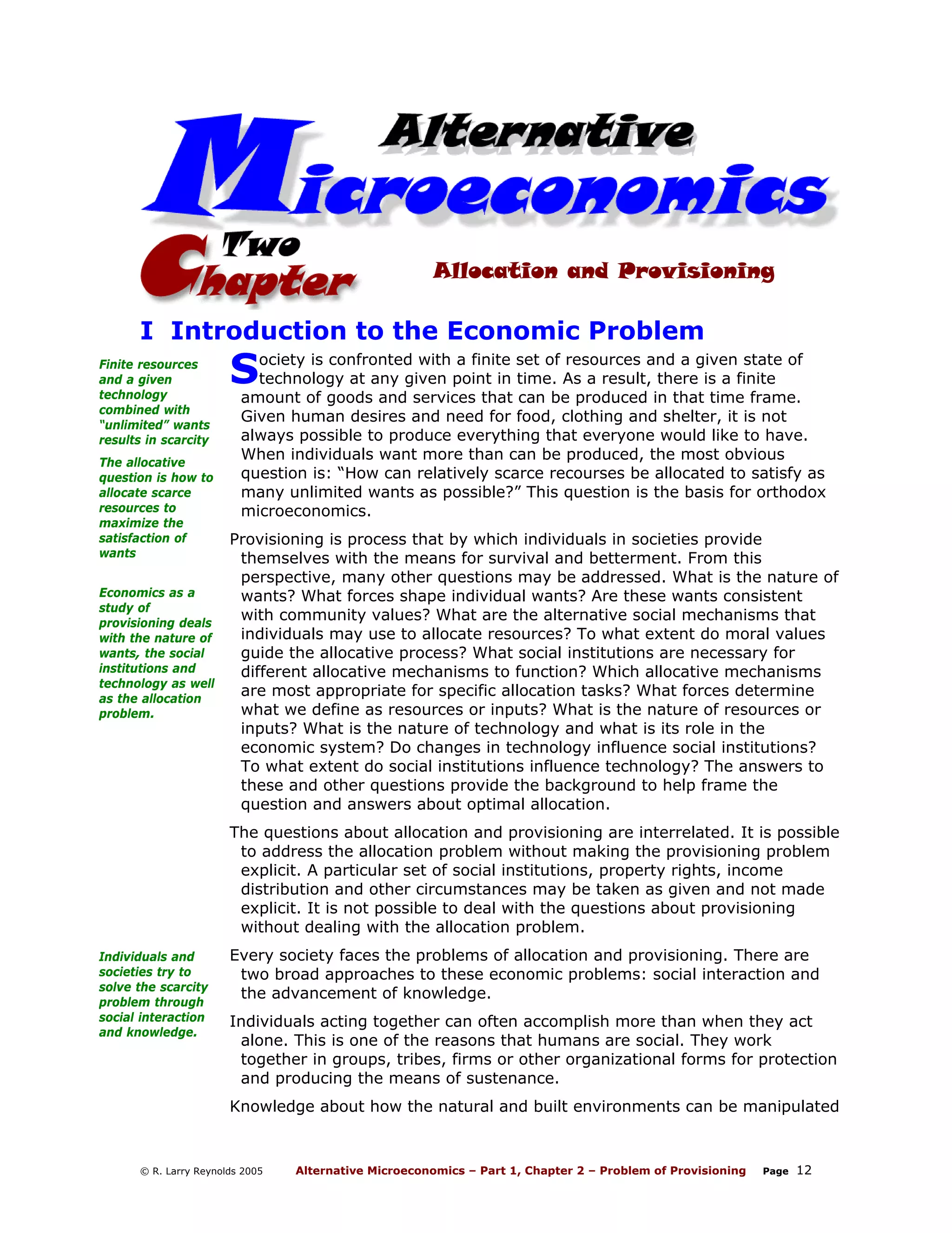 This document discusses allocation and provisioning in economics. It begins by introducing the concepts of scarcity and wants, and how economics deals with allocating scarce resources to satisfy unlimited wants. It then discusses several questions around provisioning, including the nature of wants, social institutions, technology, and their role in the economic system. The document outlines three approaches to addressing the allocation problem: increasing output, altering the mix of goods produced, and altering wants/preferences. It introduces concepts like ceteris paribus, opportunity cost, and property rights and their role in allocation mechanisms.
