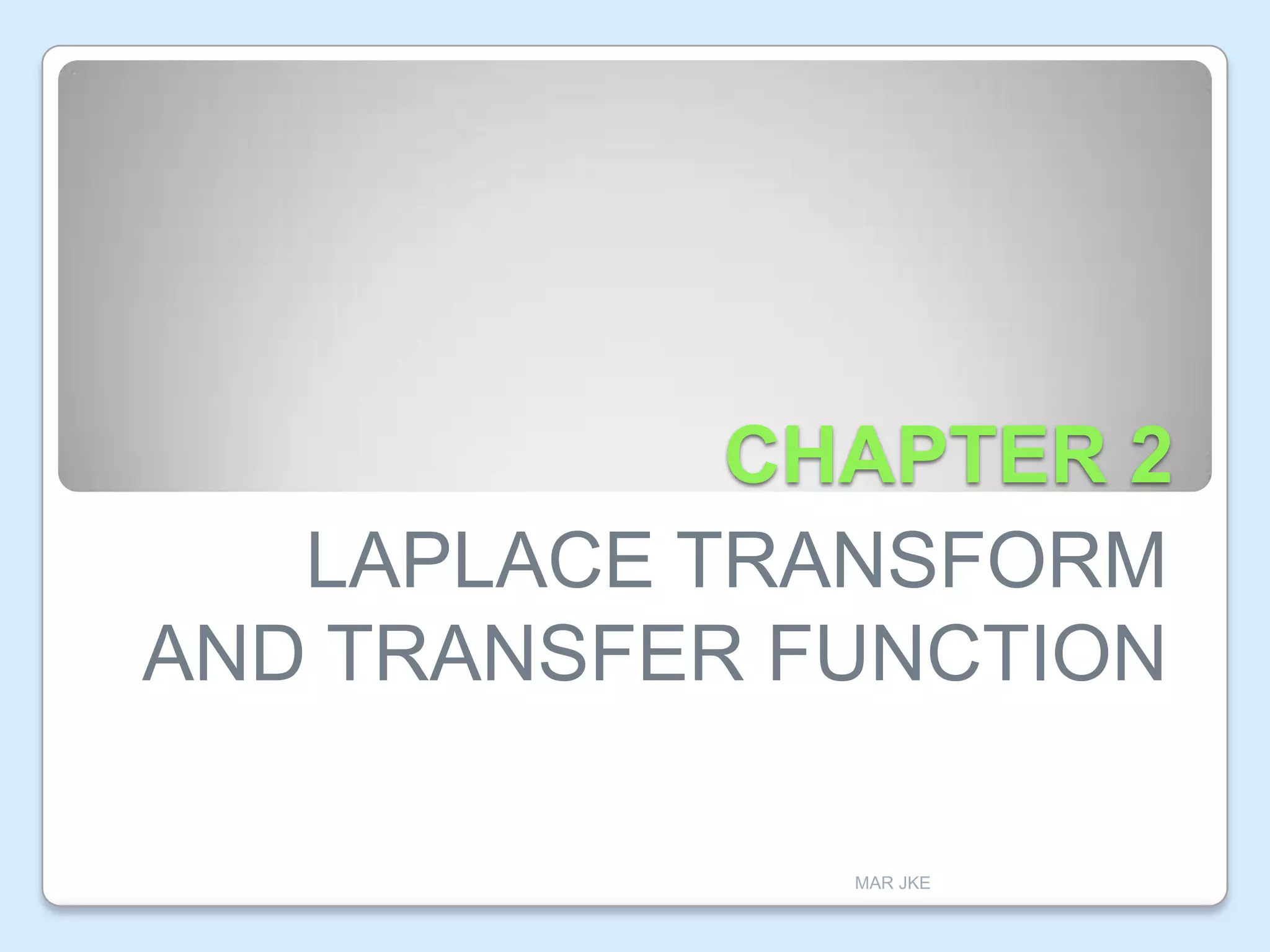 This document discusses Laplace transforms and their applications in control systems. It begins by defining the Laplace transform and explaining how it can be used to solve differential equations by transforming them from the time domain to the complex frequency domain. It then provides several properties and formulas for Laplace transforms, including derivatives, integrals, time shifts, and partial fraction decomposition. Examples are given to demonstrate finding the Laplace transform of common functions and taking the inverse Laplace transform. The document concludes by explaining how Laplace transforms can be used to analyze control systems modeled by integrodifferential equations.