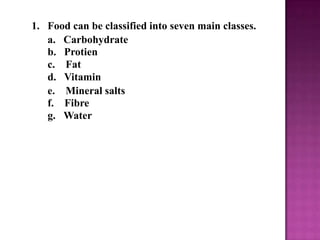 1. A balanced diet containing the seven classes of food is necessary to meet daily nutritional requirements and prevent deficiency diseases.