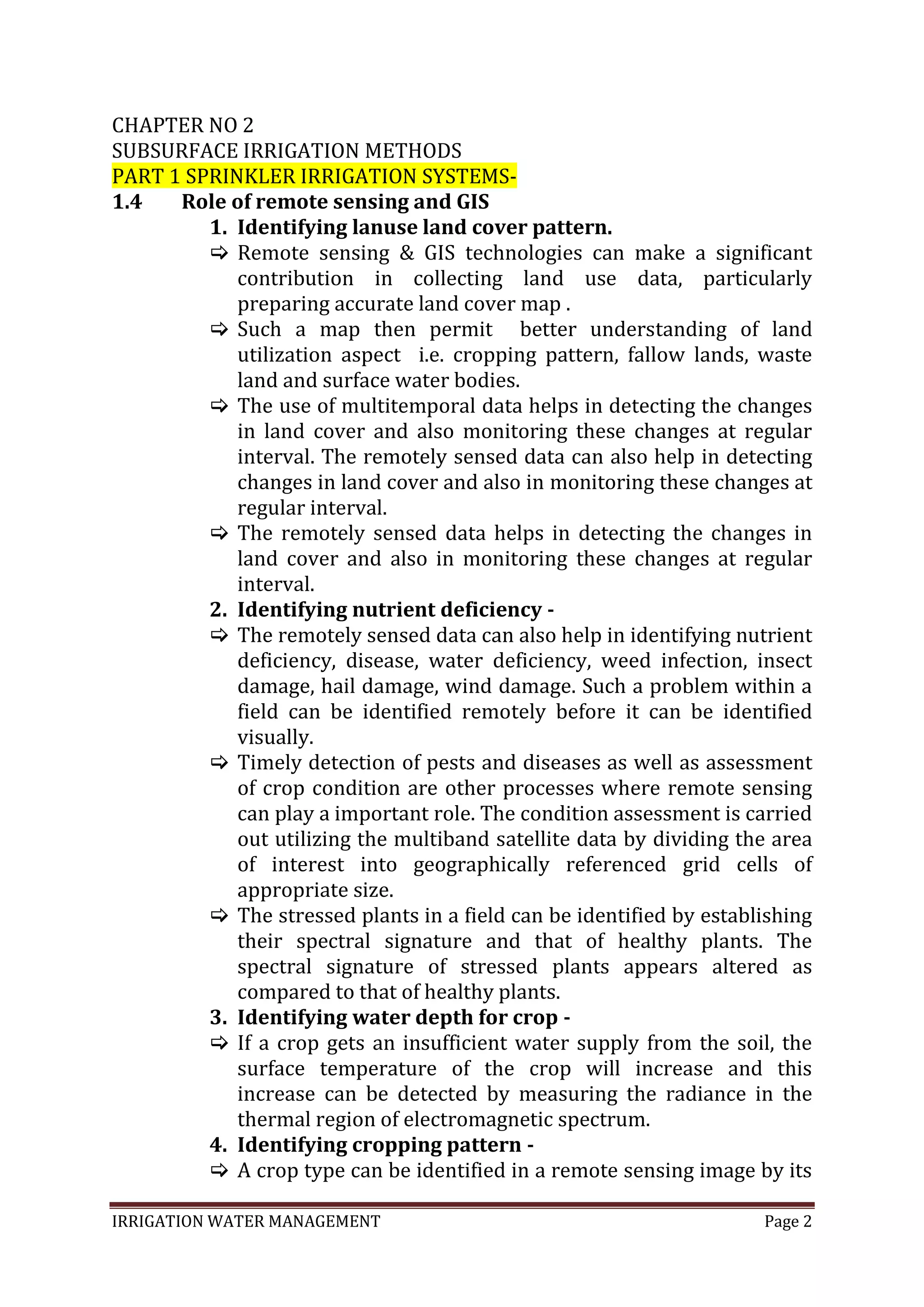 The document discusses various irrigation methods including sprinkler irrigation. It describes how remote sensing and GIS technologies can help with tasks like identifying land use patterns, crop nutrient deficiencies, optimal water levels for crops, and cropping patterns. The document also outlines the advantages and limitations of different irrigation methods such as sprinkler irrigation and subsurface irrigation.