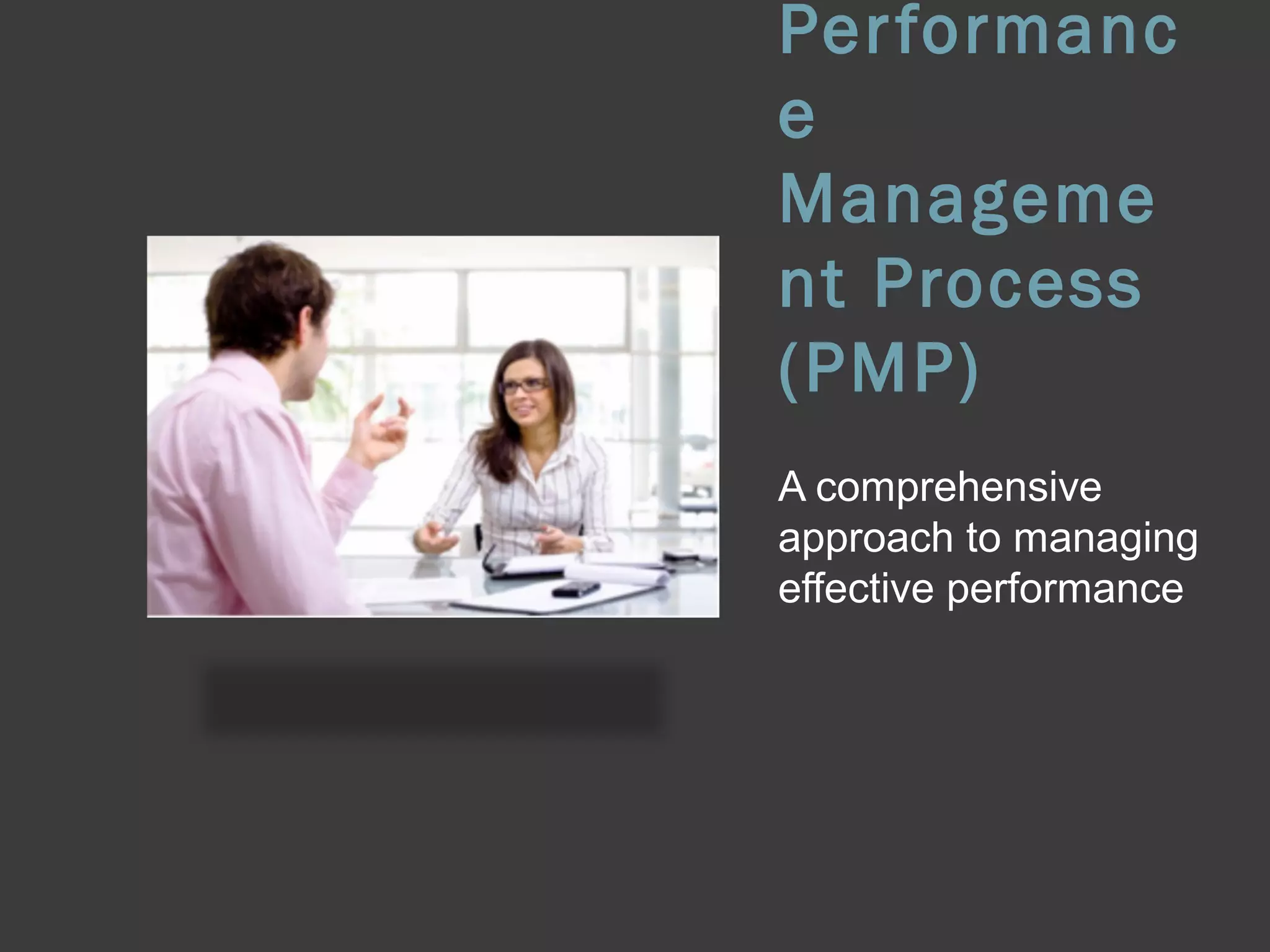 This document outlines an organization's performance management process (PMP). It includes an overview of the PMP's goals of maximizing employee engagement, development, and performance throughout the employment lifecycle. Key components of the PMP include aligning individual goals with department goals, providing regular feedback, linking performance to compensation/rewards, and focusing on employee development, talent management, and succession planning. The document provides details on developing SMART goals, tools used in the PMP, conducting performance dialogues, assessing performance, and developing individual development plans to help employees advance their careers.