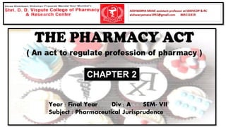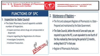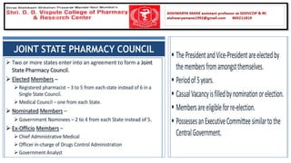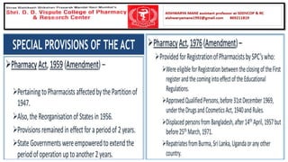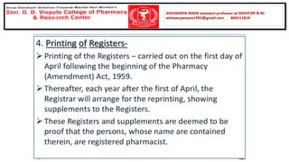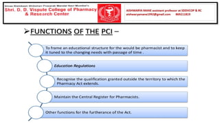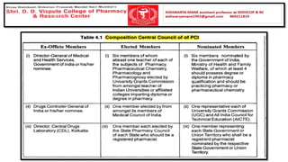 The document summarizes key aspects of the Pharmacy Act and Pharmacy Council of India (PCI). It discusses that the Pharmacy Act established the PCI to regulate pharmacy education and practice in India. The PCI frames Education Regulations to set minimum standards for pharmacy qualifications and approves courses and institutions. It also maintains the Central Register of pharmacists. State Pharmacy Councils are constituted to handle registration of pharmacists at the state level. The document outlines qualifications and processes for registration as a pharmacist in India.