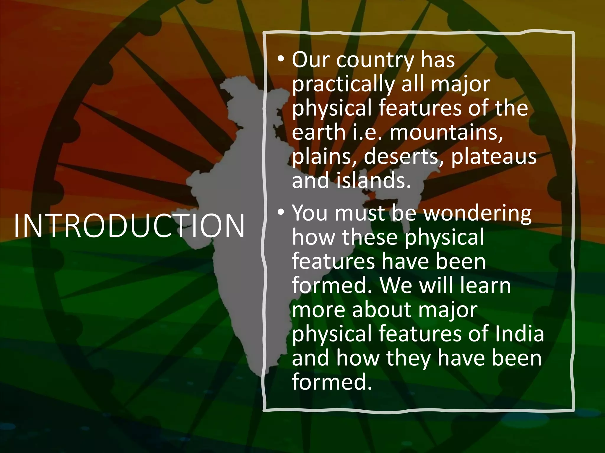 The document provides an overview of India's major physical features, explaining their formation through the theory of plate tectonics, which describes the Earth's crust movements. It details the Himalayas' structure, divisions, and the Northern Plains formed by major rivers, along with information about the Central Highlands, the Indian Desert, and island groups like Lakshadweep and Andaman-Nicobar. The content serves educational purposes, with an invitation to contact the author for additional presentation materials.