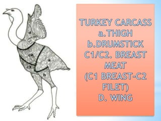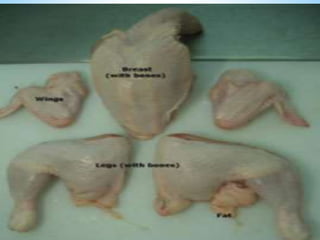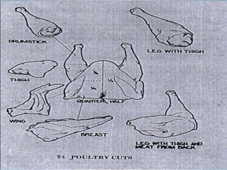 This document summarizes information about poultry production and consumption. It discusses that poultry production can be adapted to most areas of the world. In the Philippines, chicken meat accounts for 97% of total poultry consumption. It also notes that poultry has a rapid growth rate, producing meat in 8 weeks and eggs in 24 weeks. The document further provides classifications and examples of different types of poultry like chicken, duck, turkey, and procedures for dressing and processing poultry.