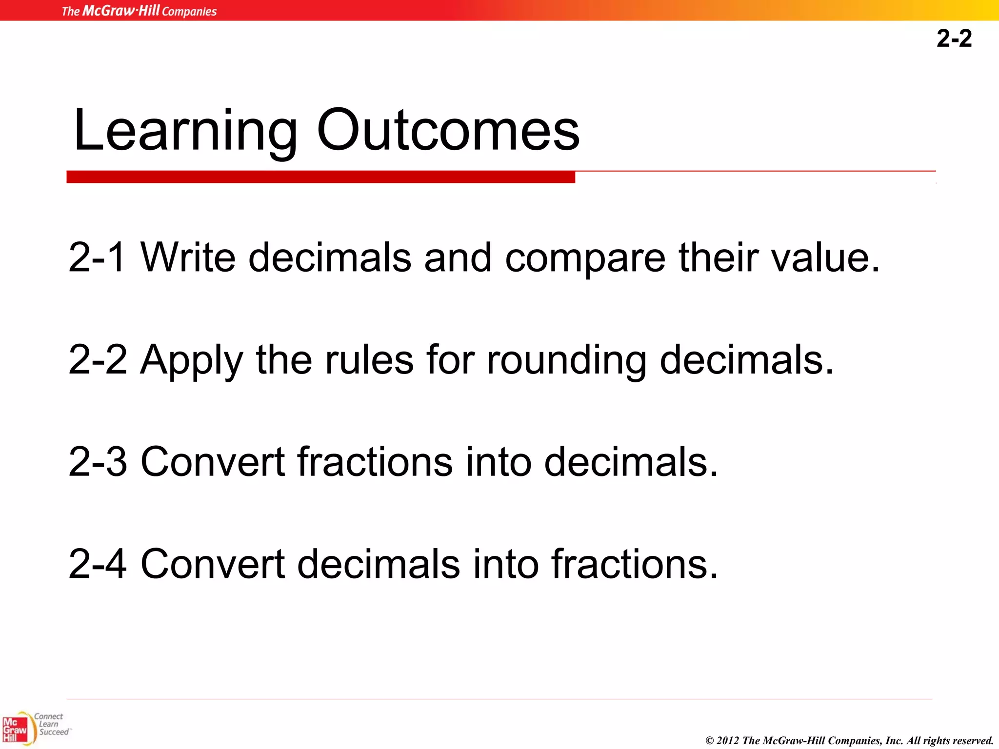 This document summarizes key concepts from Chapter 2 of a textbook on decimals. It discusses writing, comparing, rounding, and converting decimals and fractions. Arithmetic operations like addition, subtraction, multiplication and division of decimals are also covered. Examples and practice problems are provided to illustrate the rules and steps for working with decimals. The goal is to help healthcare professionals feel comfortable using decimals for dosage calculations.