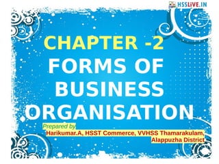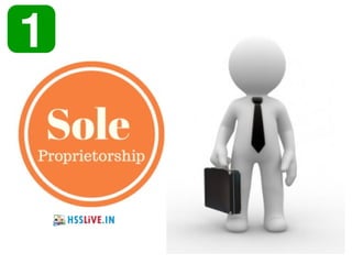 This document provides information on different forms of business organization in India. It discusses sole proprietorship, joint Hindu family business, and partnership. For each type of business, it describes their key features, merits, and demerits. Sole proprietorship is owned and controlled by one individual who bears all risks and profits. A joint Hindu family business is governed by Hindu law and controlled by the eldest member. Partnership requires at least two owners who share profits, losses, risks and control of the business.