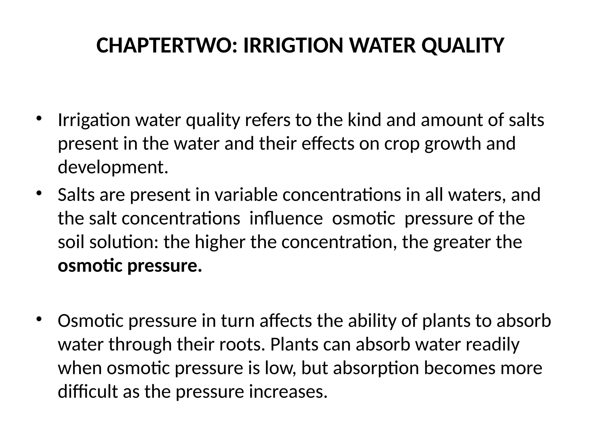 Irrigation water quality is crucial for crop growth, as salt concentrations affect the osmotic pressure in the soil, influencing water absorption by plants. High salinity and sodium levels pose significant hazards to agricultural productivity, necessitating effective management strategies such as leaching, chemical amendments, and sometimes changing irrigation methods. Understanding the specific water quality parameters, like sodium adsorption ratio and salinity, is essential for mitigating these risks and ensuring sustainable crop development.