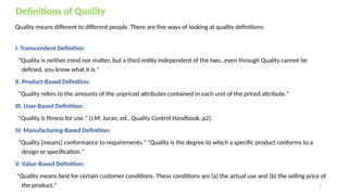 The document outlines the conceptual framework of Total Quality Management (TQM), which emphasizes various definitions of quality and a systematic approach to managing the entire organization for quality enhancement. TQM is described as a blend of philosophies and principles aimed at continuous improvement, integrating all employees and processes to exceed customer expectations. It also highlights the historical evolution of quality management and the elements, benefits, and implementation strategies associated with TQM.