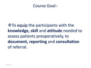 This document provides an overview of preoperative assessment, preparation, and documentation. It discusses the goals of preoperative evaluation, which include ensuring the patient is optimized for surgery and identifying any risks. The outline covers topics like the history, physical exam, investigations, and documenting the anesthesia record. Aspects of the history discussed include medical history, anesthetic history, allergies, and social history. The physical exam focuses on vital signs, cardiovascular, respiratory, airway, and neurological systems. Airway assessment involves observation, simple tests like Mallampati classification, and potential for difficult intubation. Thorough preoperative evaluation aims to reduce surgical risks and increase postoperative recovery.