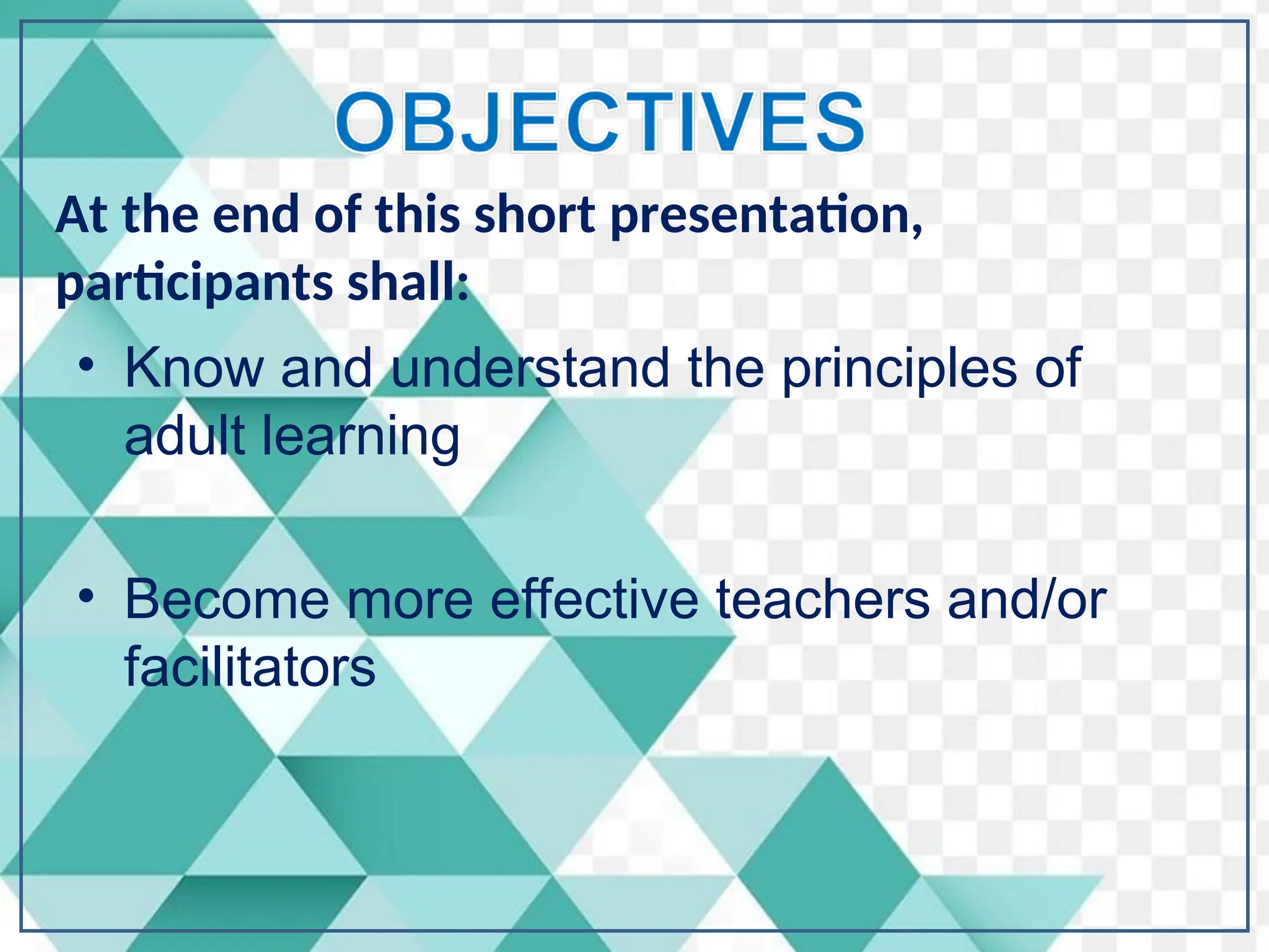 It is therefore critical for facilitators to identify objectives for adult participants before the course begins. This also means that theories and concepts must be related to a setting familiar to the participants.