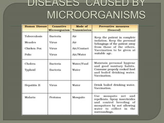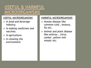 This document discusses different types of microorganisms: bacteria, algae, protozoa, fungi and viruses. It provides characteristics of each type, including their shapes (for bacteria), whether they are unicellular or multicellular, and how they reproduce. It also outlines ways that microorganisms are beneficial, such as in food production, agriculture and the environment, and how some can cause harm as pathogens in humans, animals and plants.