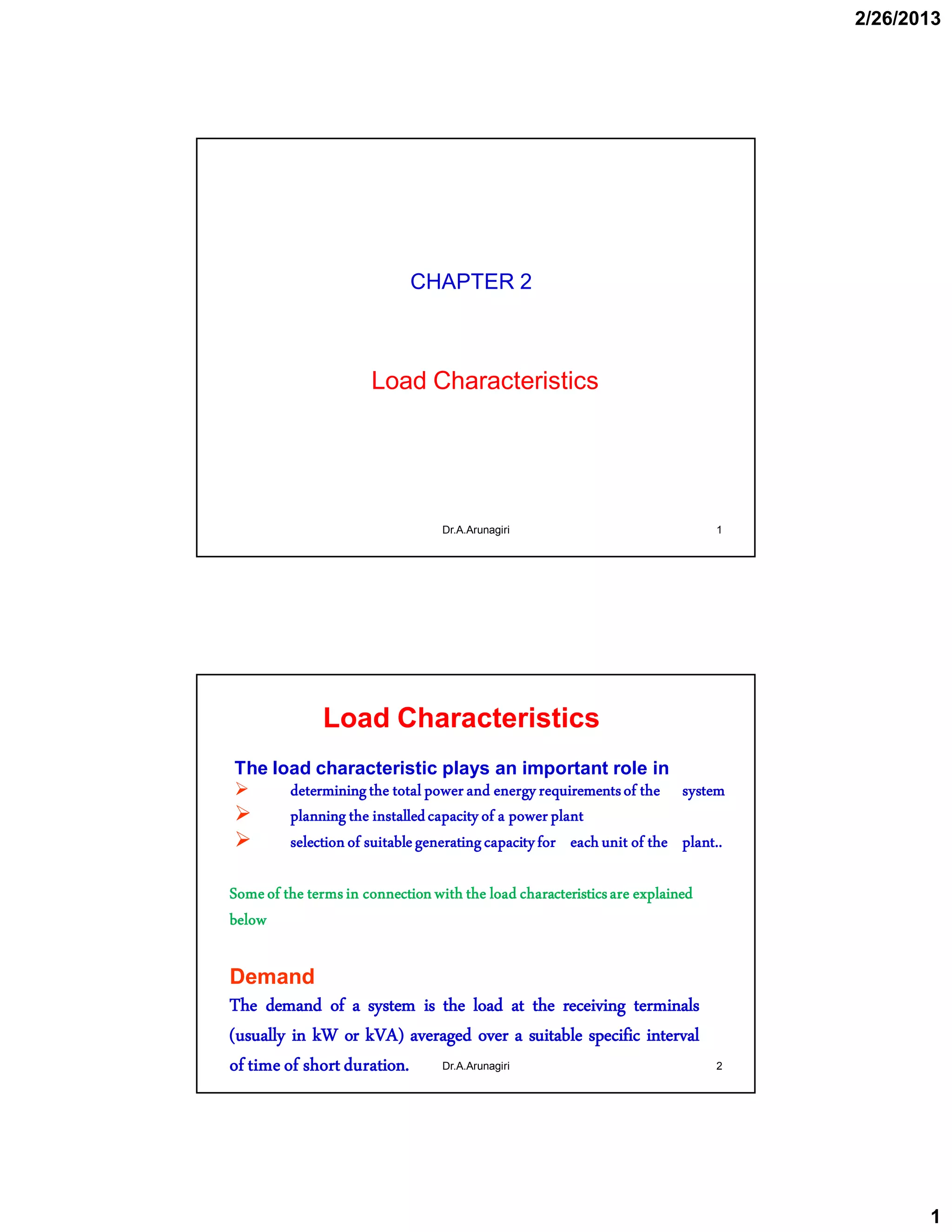 1. The document discusses load characteristics that are important for determining power system requirements, planning plant capacity, and selecting generating unit sizes. It defines terms like demand, demand interval, load curves, and load duration curves.