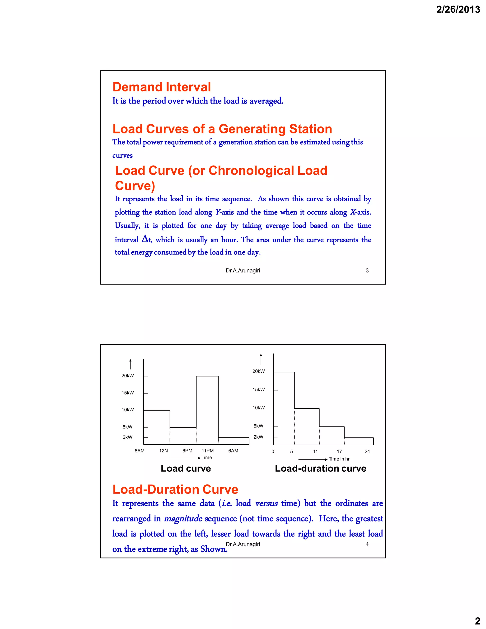 2. Load curves show the load over time, while load duration curves rearrange the loads from highest to lowest. The total load is divided into base, intermediate, and peak loads.