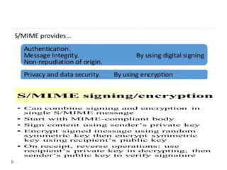 The document discusses various aspects of system security, specifically desktop, email, web, and database security. It highlights principles of security, common threats, and technologies used to safeguard information, emphasizing the need for a comprehensive approach to preserve confidentiality, integrity, and availability of data. Key topics include password management, encryption methods (S/MIME, PGP), and secure electronic transactions.