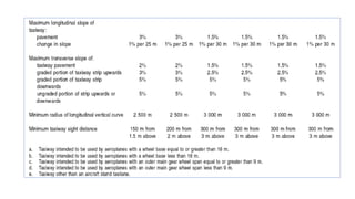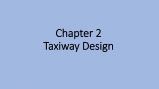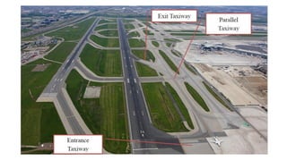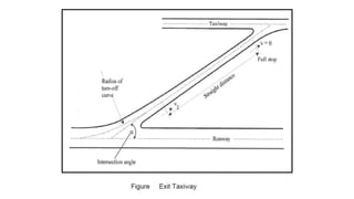 The document discusses taxiway design at airports, highlighting their role in connecting key facilities and optimizing aerodrome efficiency. It describes various types of taxiways, geometric standards, and factors influencing their layout, such as safety, capacity, and aircraft movement. Key features include the design of exit and rapid exit taxiways to minimize runway occupancy and enhance operational efficiency.