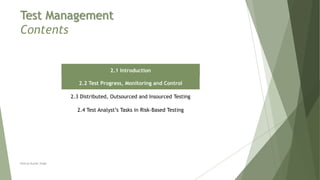 The document outlines the responsibilities of test analysts in managing the testing process, focusing on risk-based testing strategies, monitoring test progress, and effective communication in distributed or outsourced environments. It also explains the importance of tracking test cases, defect management, and risk identification, assessment, and mitigation to ensure product quality. Key tasks for test analysts include collaborating on risk strategies, maintaining communication across teams, and prioritizing test efforts based on identified risks.