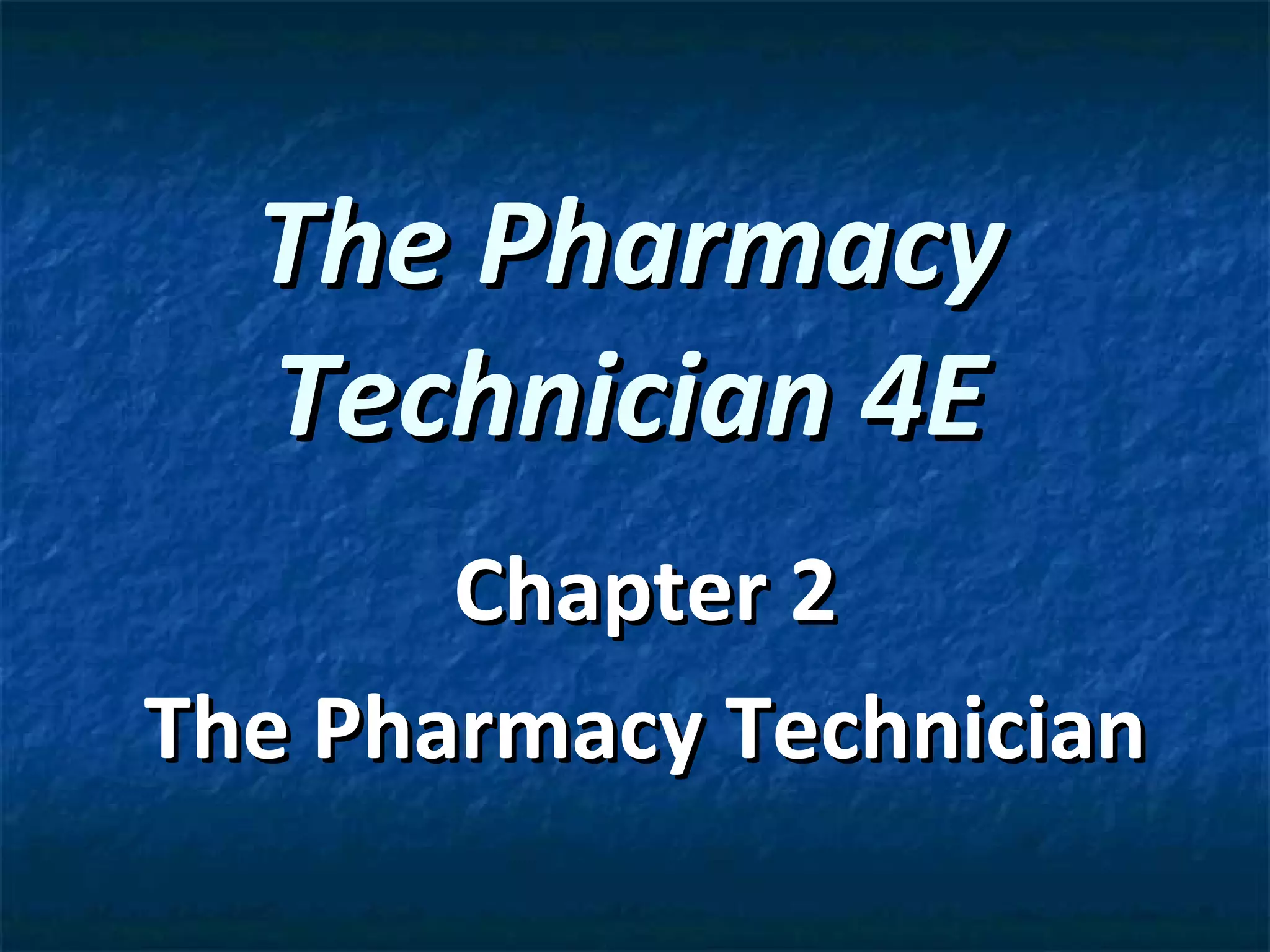 The document discusses the role and responsibilities of pharmacy technicians. It outlines that pharmacy technicians work under the supervision of licensed pharmacists to perform tasks like receiving prescriptions, filling prescriptions, and inventory management. The document also discusses the evolution of pharmacy technicians from clerks to trained assistants and the importance of certification, education, and competency in the field. It provides details on the Pharmacy Technician Certification Exam and requirements to become a certified pharmacy technician.