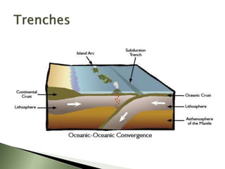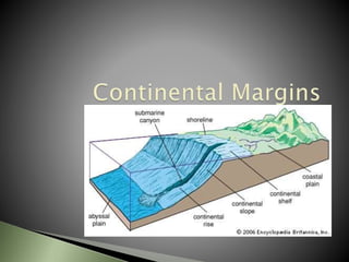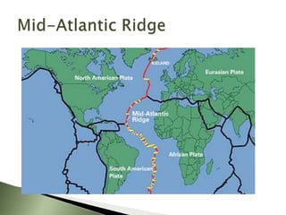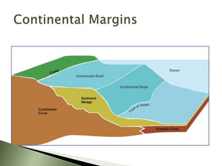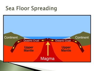 The sea floor is about 4.6 billion years old and covers most of the Earth's surface. It is composed of ocean basins like the Pacific, Atlantic, Indian, and Arctic oceans. The sea floor is constantly changing through the process of plate tectonics, where lithospheric plates move across Earth's surface. New sea floor is created at mid-ocean ridges through the process of sea floor spreading, while ocean trenches form as plates subduct under each other. The structure and composition of the sea floor provides clues about Earth's geological history.