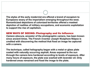 The document provides an overview of the development of photography and realist painting from the early to late 19th century in Europe and America. It discusses key figures and works that advanced realism and naturalism in art, moving from romanticized depictions to more objective styles influenced by photography. These include Daguerre, Niepce, Courbet, Manet, Monet, Degas, and Eakins among others. It also covers the emergence of impressionism from realism and its rejection of academic styles in favor of capturing fleeting visual impressions of light and motion.