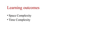 The document discusses algorithm learning outcomes with a focus on time and space complexity, definitions, and asymptotic analysis rules. It outlines how to evaluate an algorithm's performance based on the amount of memory required and the number of operations performed. Several example algorithms illustrate these concepts, including swap, sum, add, and multiply, alongside their respective time and space complexities.