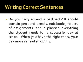This document provides tools and rules for writing correct sentences, including: