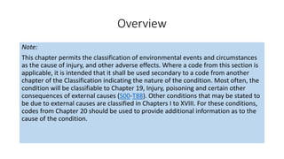 This document provides guidance on using external cause of morbidity codes from ICD-10-CM Chapter 20. It explains that these codes classify environmental events, circumstances, and intent of injury. They are always used as secondary codes along with a code for the nature of the condition. The document outlines the blocks of codes in Chapter 20 and provides coding guidelines on proper use of external cause codes, such as always assigning as many codes as needed to fully describe the cause of injury.