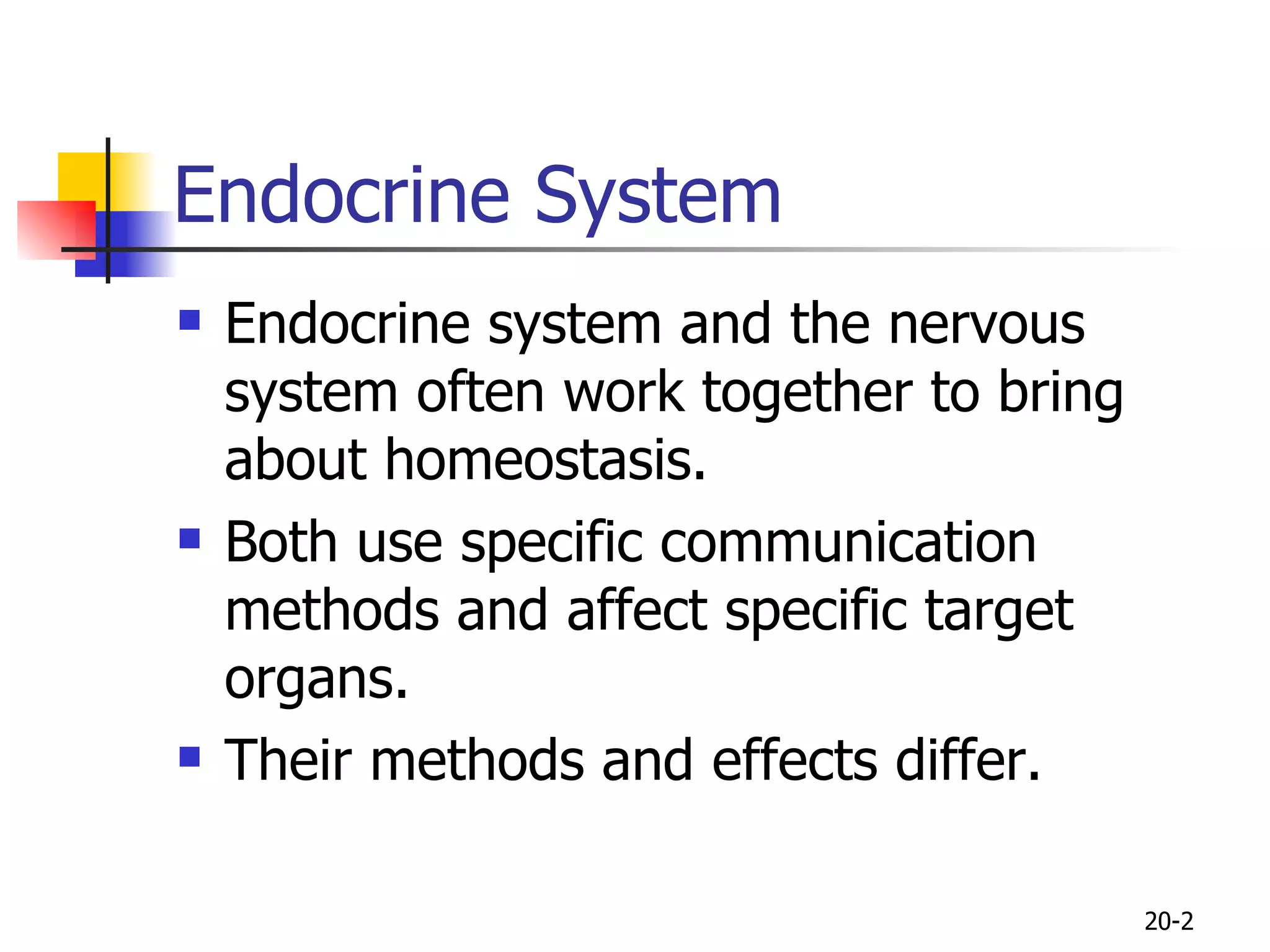 1) It discusses the differences between the nervous and endocrine systems in their communication methods, target organs, and effects.